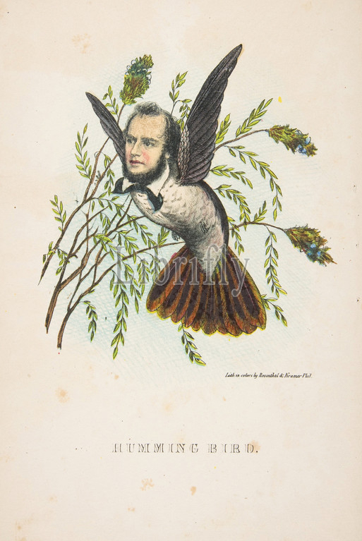 Humming Bird, Thomas B, Florence, Comic Natural History, Human Race, 1851, Color lithography, watercolor, gum, sheet, 11 x 7, 27.9 17.8 cm, Prints, Henry Louis Stephens, American, Philadelphia, Pennsylvania, 1824–1882, Bayonne, New Jersey