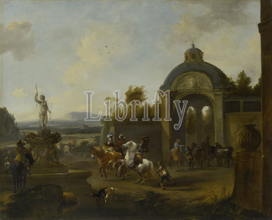 Hunting Party, Fountain, Hunting party, fountain, hunting party, ladies, gentlemen, horseback, servants, dogs gather, statue, Diana, gate, country house, Pieter Wouwerman, 1660, 1682, canvas, oil paint, paint