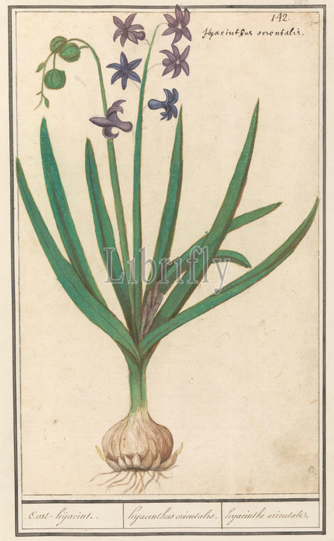 Hyacinth, Hyacinthus orientalis, Eastern hijacint, hyacinth orientale, title, object, Blue hyacinth, Numbered top right, 142, Top right, Latin name, Part, second album, drawings, flowers, plants, Ninth, twelve albums, animals, birds, 1600, commissioned, Emperor Rudolf II, explanations, Dutch, Latin, French, Flowers, hyacinth, Anselmus Boetius de Boodt, 1596, 1610, paper, watercolor, paint, deck paint, ink, chalk, pen