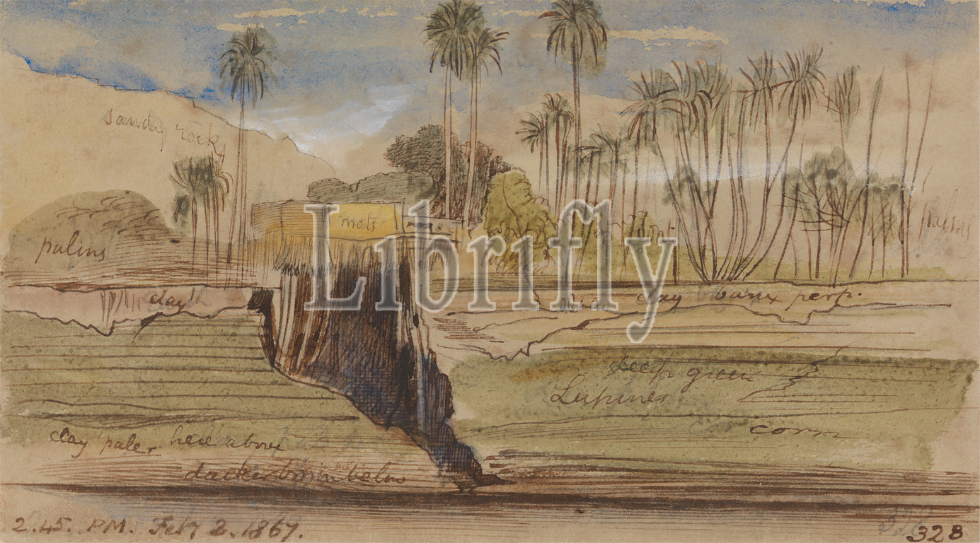 Ibreem, Wady Halfeh, 2, 45 pm, 2 February 1867, 328, Edward Lear, 1812–1888, British, 1867, Watercolor, pen, brown ink, gouache, graphite, moderately thick, moderately textured, gray wove paper, Sheet, landscape, palm trees, sky, structures, single built works, Africa, -Sudan, Egypt, Nile, Nubia, Nubia, Qasr Ibrim, Wadi Halfa