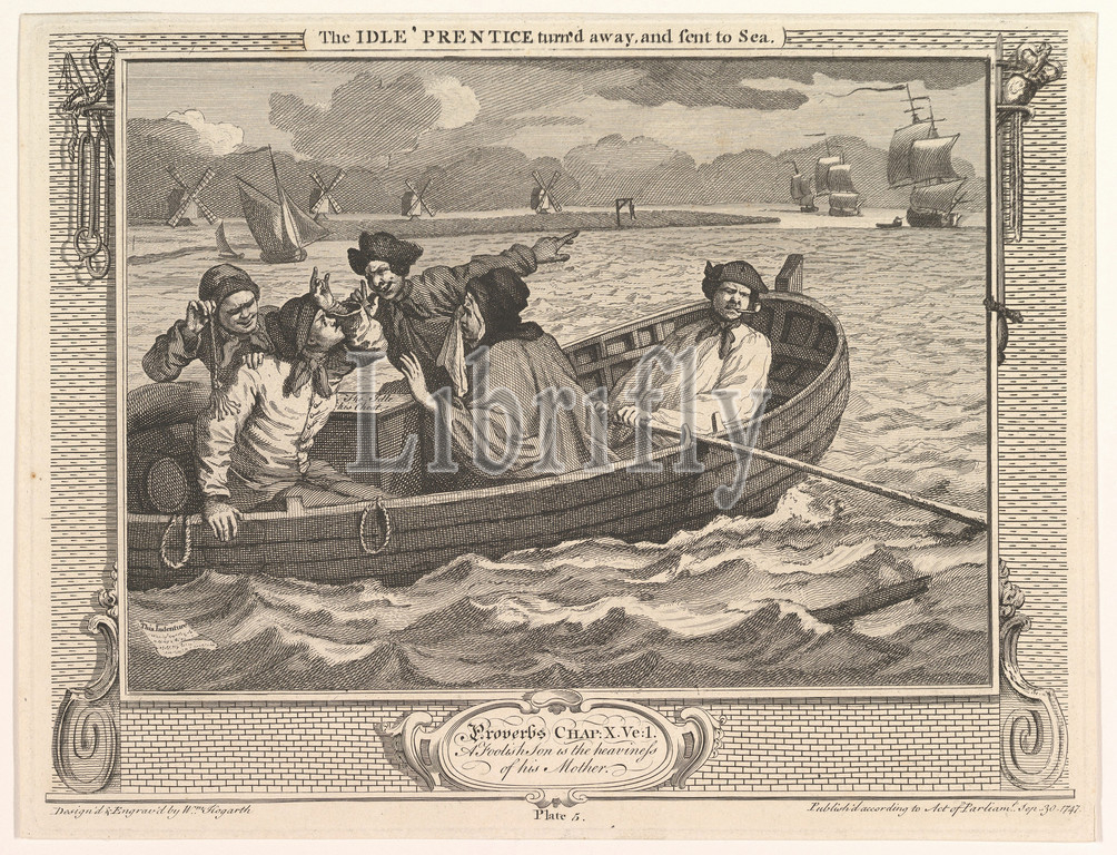 Idle, Prentice Turned Away, Sea, Industry, Idleness, plate 5, September 30, 1747, Etching, engraving, second state, three, plate, 10 3/8 x 13 9/16, 26.4 34.5 cm, Prints, William Hogarth, British, London, 1697–1764