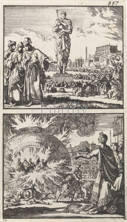 The idol of Nebuchadnezzar, Three young men in the fiery furnace, Jan Luyken, Barent Visscher, Andries van Damme, 1698
