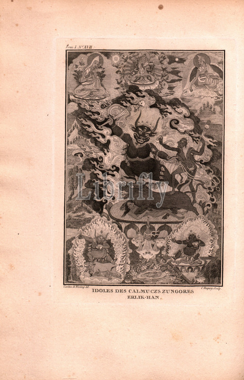 Idols of Calmucz Zungores Erlik-Han, Religion and Mythology: Idol of Herlick-Han, the devil, the god of the Kalmyk Underworld, Signed: Carême de Fêcamp (del.), C. Baquoy (sculp.), Copperplate engraving, no. XVII, after p. 306 (vol. 1), Fécamp, Carême de ; Baquoy, Jean-Charles, 1768, Jean Chappe d'Auteroche: Voyage en Sibérie fait par ordre du roy en 1761: contenant les moeurs, les usages des Russes, et l'etat actuel de cette puissance. Paris: chez Debure, 1768.