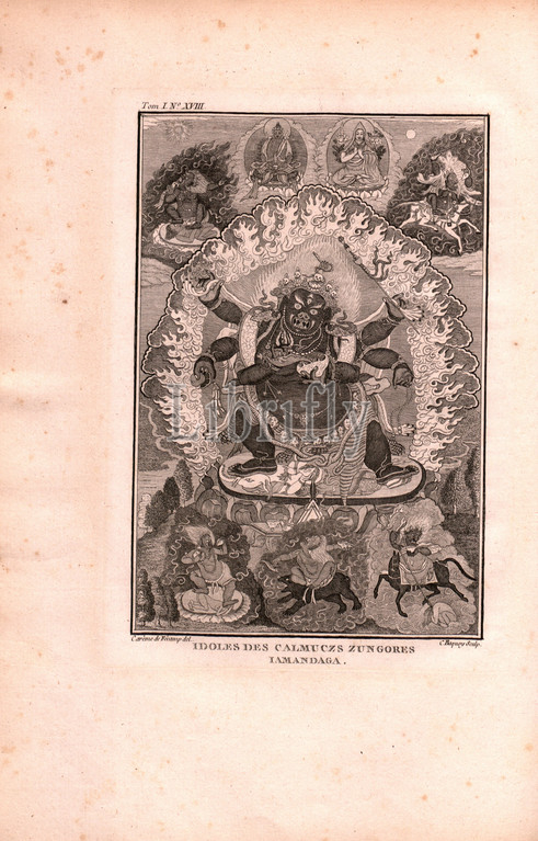 Idols of Calmuczs Zungores Iamandaga, Religion and Mythology: Idol of the Iamandaga, a king of the Western Mongolian people, the Kalmyks, Signed: Carême de Fêcamp (del.), C. Baquoy (sculp.), Copperplate engraving, no. XVIII, according to p. 302 (vol. 1), Fécamp, Carême de ; Baquoy, Jean-Charles, 1768, Jean Chappe d'Auteroche: Voyage en Sibérie fait par ordre du roy en 1761: contenant les moeurs, les usages des Russes, et l'etat actuel de cette puissance. Paris: chez Debure, 1768.