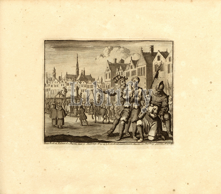 Iean Koch et Léonard Meyster, tueez of Ausbourg, Anno 1524, Parallel title: Hans Koch and Leonard Meyster killed at Augsburg, A nn o 1524, copperplate engraving, 50.), p. 109, Luyken, Jan (inv. et fec.), Jan Luyken: Théâtre des martyrs: depuis la mort de J.Christ jusqu'à present: représenté en très belles tailles-douces = Schau-Bühne der Martyrer; gezeichnet und in Kuppfer gestochen. Leyde: chez Pierre Van der Aa, [1711]