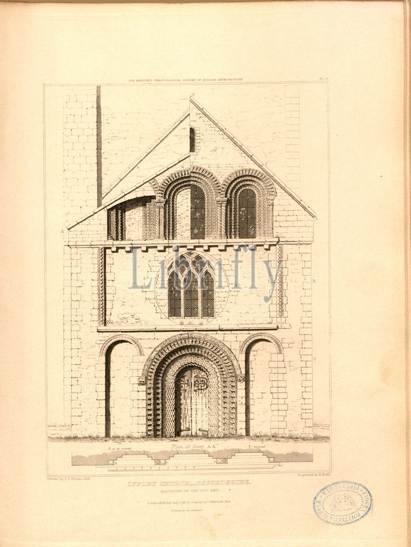 Iffley Church, Oxfordshire, elevation of the west end, Elevation of St Mary's Church at Iffley in Oxfordshire, signed: Drawn by C.F. Porden; Engraved by R. Roffe; Published by Longman & Co, Fig. 9, Pl. II, after p. 260, Porden, C. F. (drawing); Roffe, Richard (engraving); Longman & Co. (published), 1818, John Britton: The architectural antiquities of Great Britain: represented and illustrated in a series of views, elevations, plans, sections and details of various ancient English edifices: with historical and descriptive accounts of each. Bd. 5. London: J. Taylor, 1807-1826