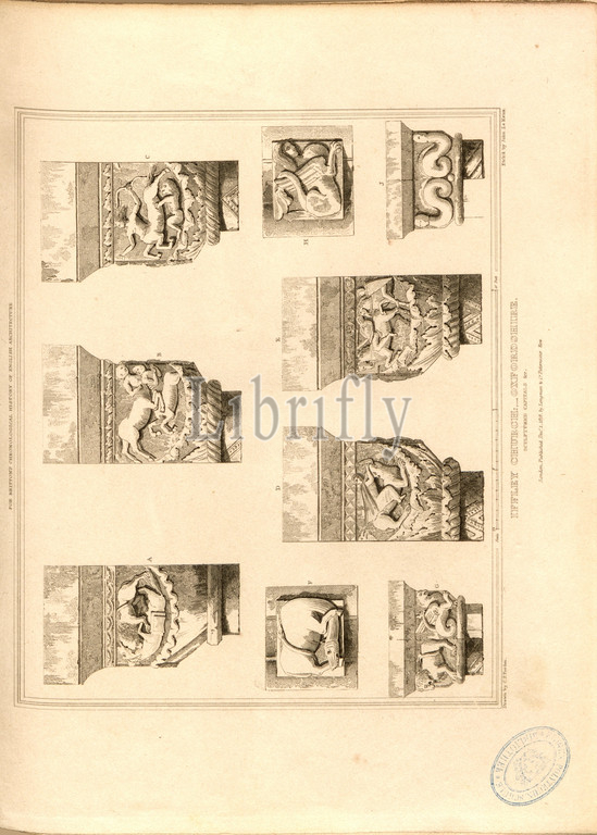 Iffley Church, Oxfordshire, sculptured capitals, Capitals of St Mary's Church at Iffley in Oxfordshire, signed: Drawn by C.F. Porden; Etch'd by John Le Keux; Published by Longman & Co, Fig. 12, after p. 260, Porden, C. F. (drawing); Keux, John Le (etching); Longman & Co. (published), 1818, John Britton: The architectural antiquities of Great Britain: represented and illustrated in a series of views, elevations, plans, sections and details of various ancient English edifices: with historical and descriptive accounts of each. Bd. 5. London: J. Taylor, 1807-1826