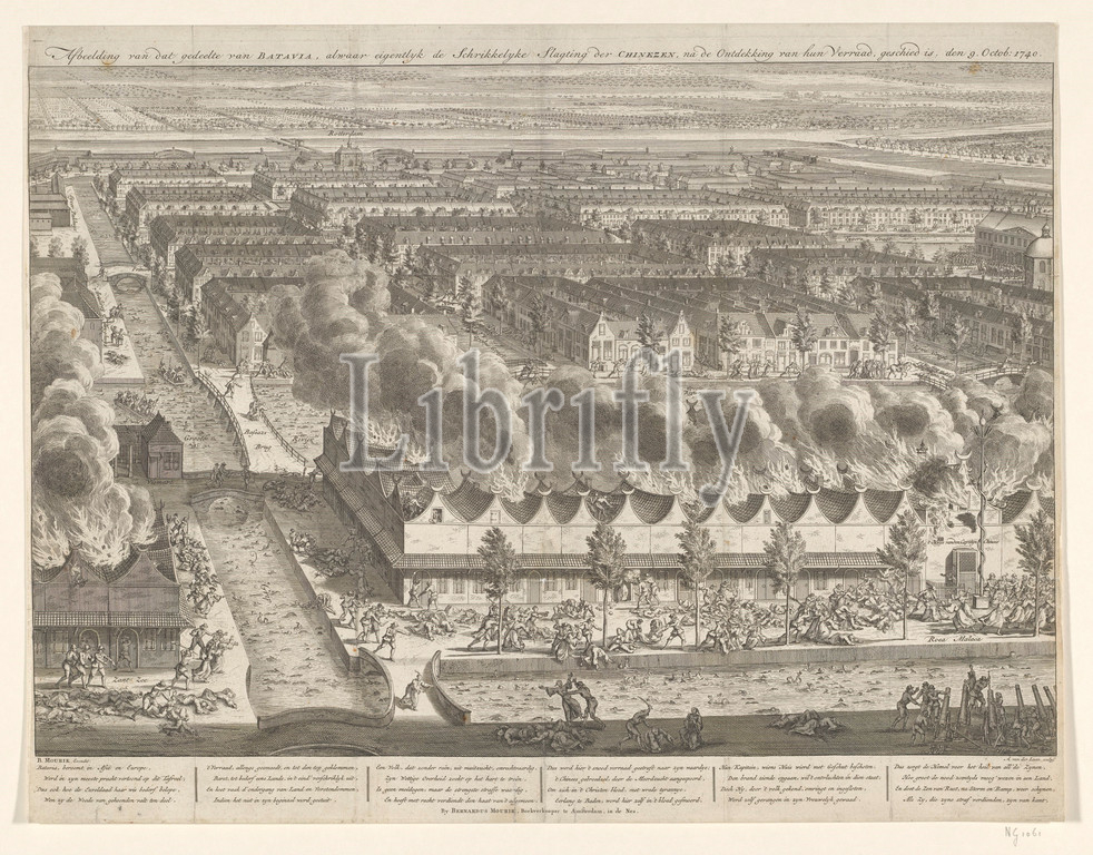 Image of that part of BATAVIA, where the Terrific Slagting of the CHINESE was hatched after the Discovery of their Betrayal, the 9. Octob: 1740, Engraving, bird's eye view of a city (Batavia) with canals and blocks of houses, in the foreground a block of burning houses (on facades a half moon) with fighting men grouping on the canal in front of it, in the foreground a battery of guns. above: title, under verse in six columns (six strophes of four lines each). Signed, r.o .: A. van der Laan sculps, Java, Adolf van der Laan, Amsterdam, 1741, paper, engraving, h 42.5 cm × w 55 cm