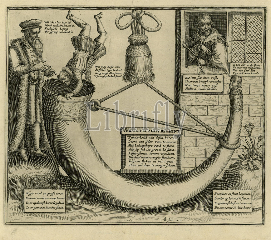 Imagination of the proverb 'Consider before you begin' Cartoon on the Arminians, 1618 Versint eer ghy beghint (title on object), Moralistic performance that is sometimes interpreted as a cartoon on the Arminians in 1618. The inscription in the middle 'Versint eer ghy beghint' better indicates the subject of the performance. Despite the warnings of an old man, a young man dives into the wide opening of a large horn. However, he then gets stuck in the narrow end. On the right, a smiling jester looks out the window and expresses the moral of the print, the saying 'Think before you begin' or 'He works his way up.', anonymous, 1618, paper, engraving, h 288 mm × w 328 mm