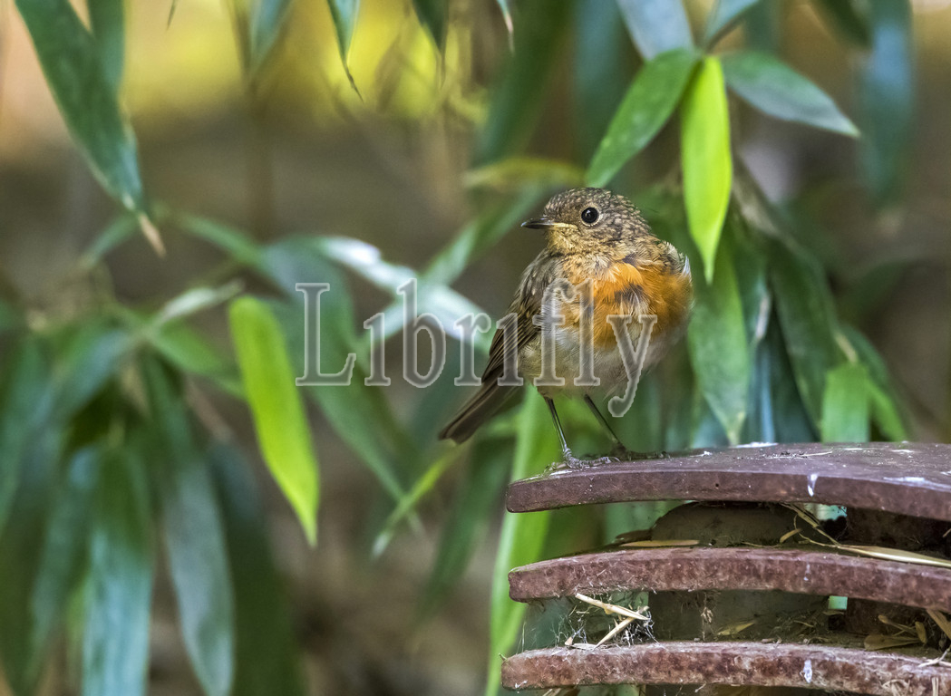 Immature male European Robin perched in a zoo, Brabant, Belgium July 2016, Erithacus rubecula