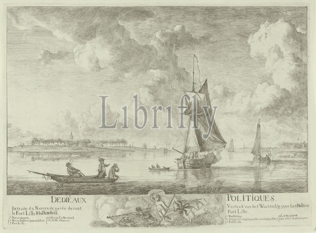 The imperial brig sails past the watch-ship on the Scheldt, 1784 Retreite du Nevire the guard of the Fort Lillo Hollandois / Departure of the watch-ship for the Hollans Fort Lillo (title on object), River landscape with the incident in which the imperial brigade Louis passed Fort Lillo and the Dutch guard ship the Scheldt, 8 October 1784. In the margin below the performance the titles, the assignment 'Dedié aux Politiques' and legends in French and Dutch on either side of a allegorical vignette with two fighting putti with the imperial and the Dutch banner. The print includes a pendant, ships (in general) (propulsion of vehicle, ship, etc. by wind), Lillo, Scheldt, Fort Lillo, anonymous, Northern Netherlands, 1784, paper, engraving, h 252 mm × w 347 mm