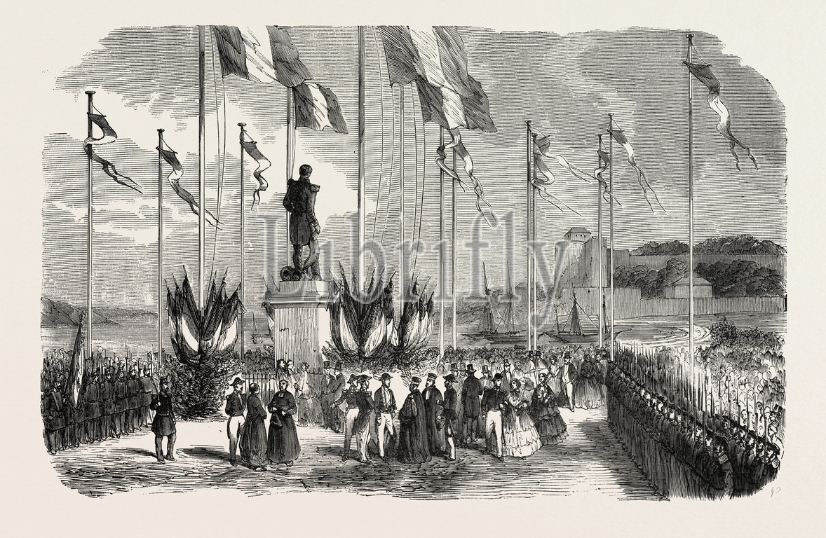 inauguration, sculpture, monument, statue, admiral, le ray pornic, august, 12, 1855, engraving 1855, engraved image, history, illustrative technique, engravement, 19th century, engraving, victorian, arts, culture, 19th century style, retro styled, vintage, retro, arkheia