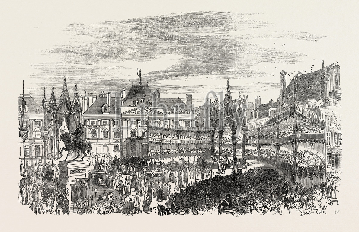 inauguration, sculpture, monument, statue, joan of arc, orleans, france, jeanne d'arc, engraved image, history, illustrative technique, engravement, 19th century, engraving, victorian, arts, culture, 19th century style, retro styled, vintage, retro, arkheia