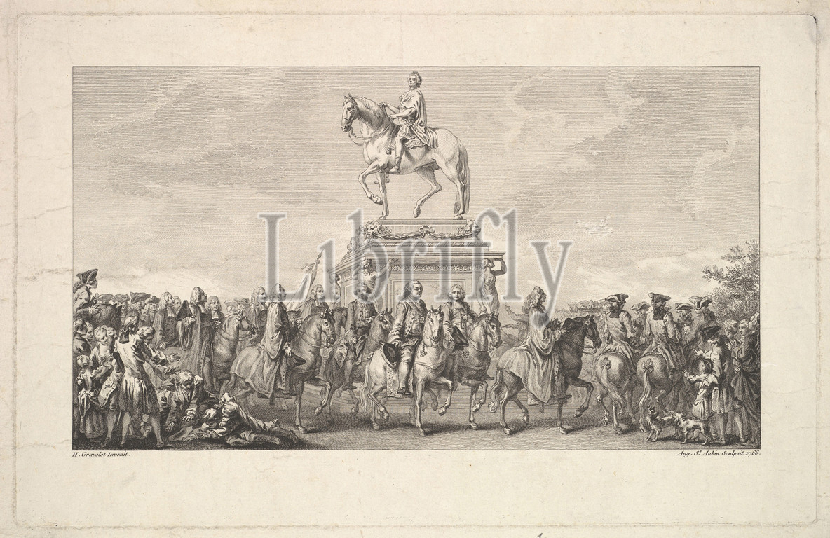 Inauguration, Statue, Louis XV, Vignette, page 1, Description des Travaux qui ont préédé, accompagné et suivi la fonte en bronze d, seul jet de Statue Equèstre Louis XV le bien-aimé dressée sur, Lempereur ancien Echevin, Par, Mariette, Honoraire amateur l'Académie Royale Peinture Sculpture, Paris l'Imprimerie P.G, Le Mercier, 1766, Etching, engraving, second state, two, Bocher, Sheet, 8 1/8, 12 5/8, 20.7, 32 cm, Prints, Augustin Saint-Aubin, French, Paris, 1736–1807, After Hubert François Gravelot, 1699–1773