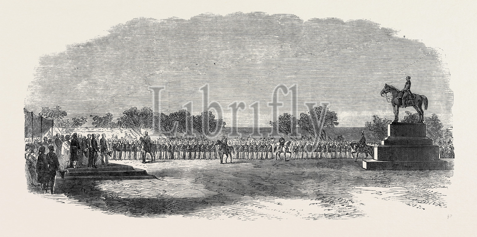 inauguration, sculpture, monument, statue, sir, mark, cubbon, bangalore, india, 1866, 1866 engraving, engraved image, history, illustrative technique, engravement, victorian, arts, culture, retro styled, vintage, retro, arkheia