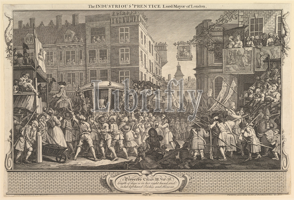 Industrious, Prentice Lord Mayor, London, Industry, Idleness, plate 12, September 30, 1747, Etching, engraving, second state, three, sheet, 10 9/16 x 15 13/16, 26.9 40.2 cm, Prints, William Hogarth, British, 1697–1764