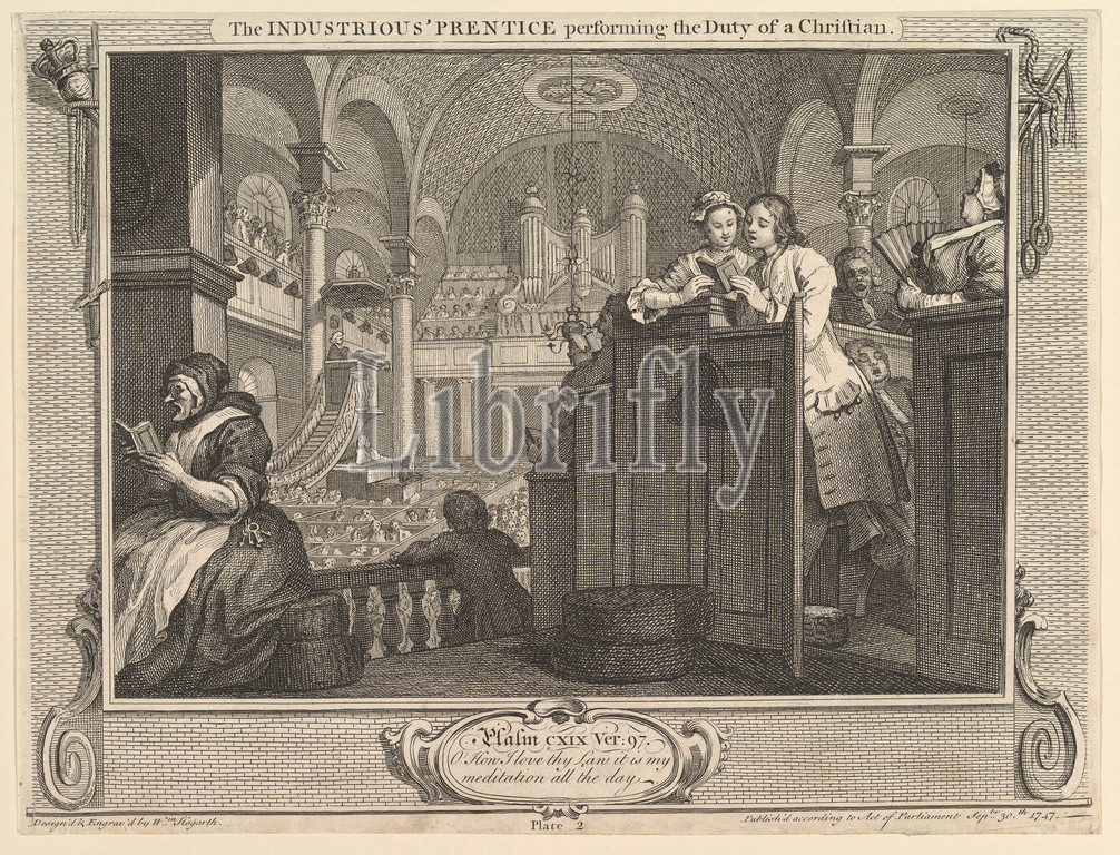 Industrious, Prentice Performing, Duty, Christian, IIndustry, Idleness, plate 2, September 30, 1747, Etching, engraving, first state, two, sheet, 10 3/8 x 13 3/4, 26.4 34.9 cm, Prints, William Hogarth, British, London, 1697–1764
