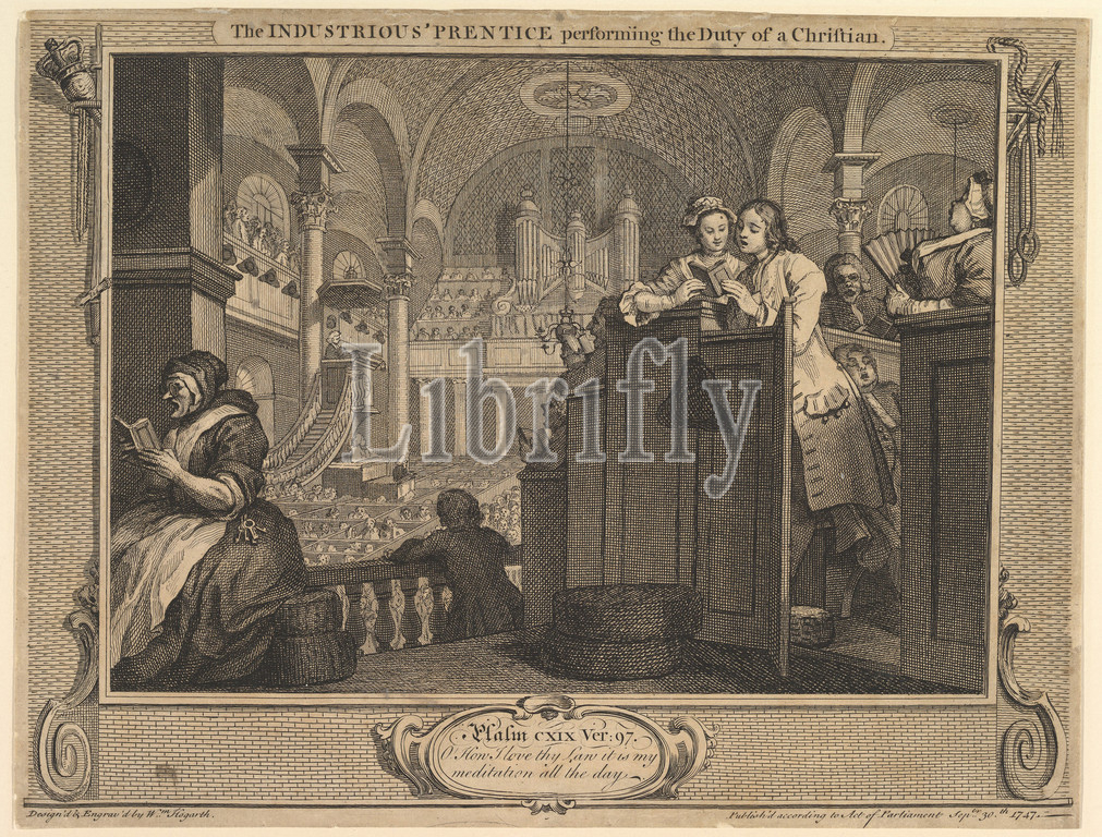 Industrious, Prentice Performing, Duty, Christian, Industry, Idleness, plate 2, September 30, 1747, Etching, engraving, first state, two, sheet, 10 3/8 x 13 3/4, 26.4 34.9 cm, Prints, William Hogarth, British, London, 1697–1764