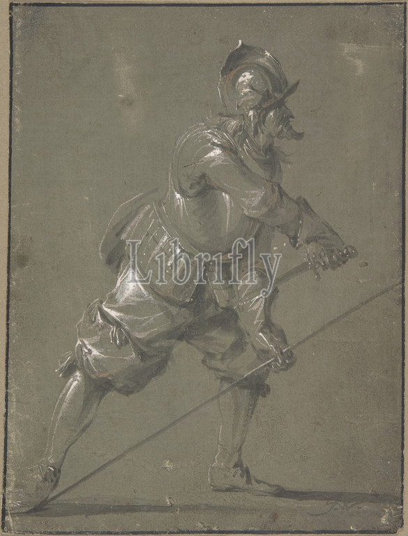 Infantryman Drawing, Sword, 1640–91, Brush, gray, light brown wash, heightened, white, gray-green prepared paper, sheet, 7 1/4 x 5 1/2, 18.4 13.9 cm, Drawings, Jacob Matthias Weyer, German, Hamburg, 1620–1691
