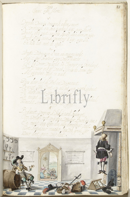 Inn interior with two dead and a drinker, Inn interior with two dead and a drinker under a drinking song to the tune of Coomt my Flora. The speaker proposes to drink away all the sorrow in love. In the background of the drawing, a woman shouts at her husband: the knave. etc., draughtsman: Gesina ter Borch, Gesina ter Borch, Zwolle, c. 1658, paper, brush, height 313 mm × width 204 mm