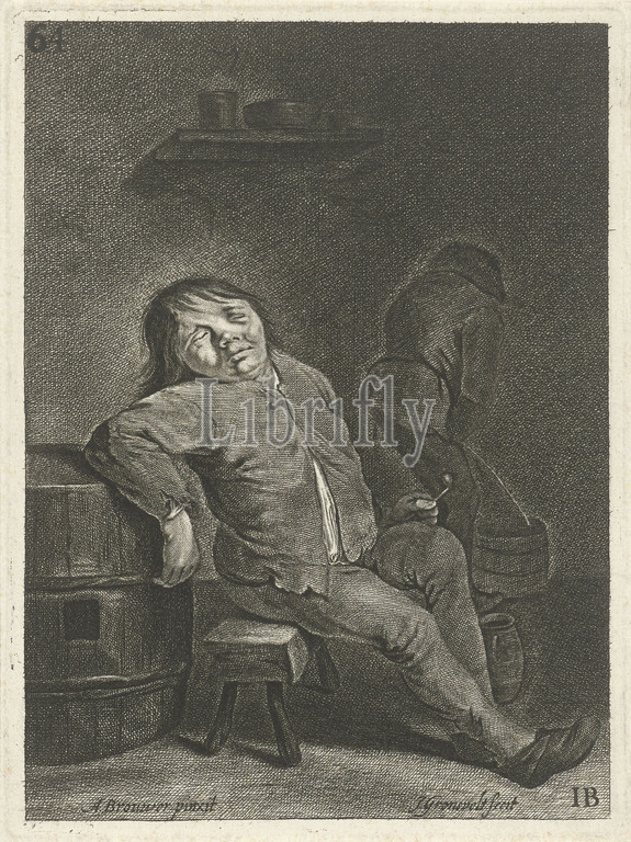 Inn interior, two farmers, sleeping farmer, stool, leaning, barrel, pipe, left hand, right, farmer, back, peeing, bucket, sleeping, chair, Johannes Gronsveld, mentioned, object, Amsterdam, 1679, 1728, paper, engraving