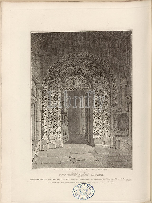 Inner Doorway to Malmesbury Abbey Church, Wiltshire, Malmsbury Abbey Church, signed: Engraved by J. Roffe from a Drawing by J. C. Smith, Fig. 54, Pl. IX, after p. 12, Smith, Joseph C. (Drawing); Roffe, John (engr.), 1807, John Britton: The architectural antiquities of Great Britain: represented and illustrated in a series of views, elevations, plans, sections and details of various ancient English edifices: with historical and descriptive accounts of each. Bd. 1. London: J. Taylor, 1807-1826