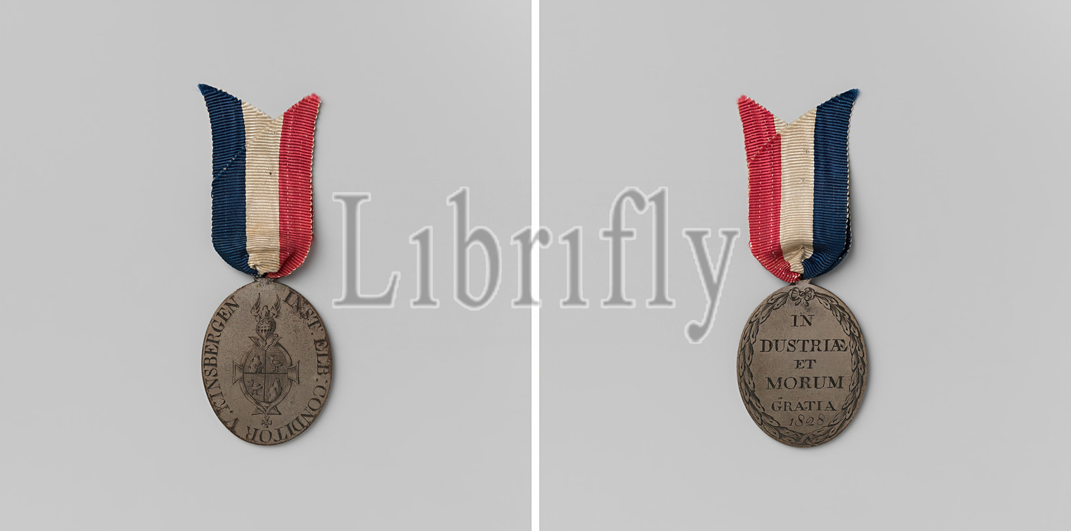 Institute of Kinsbergen in Elburg, Silver oval medal with eyelet on red-white-blue ribbon. Obverse: a helmeted coat surrounded by the order of H. Anna and Alexander Newsky within a cover. Reverse: inscription within laurel wreath, Elburg, Jonkheer Jan Hendrik van Kinsbergen, anonymous, Netherlands, 1806, silver (metal), engraving, h 4.1 cm × w 2.9 cm × w 12.85 gr × l 4.1 cm