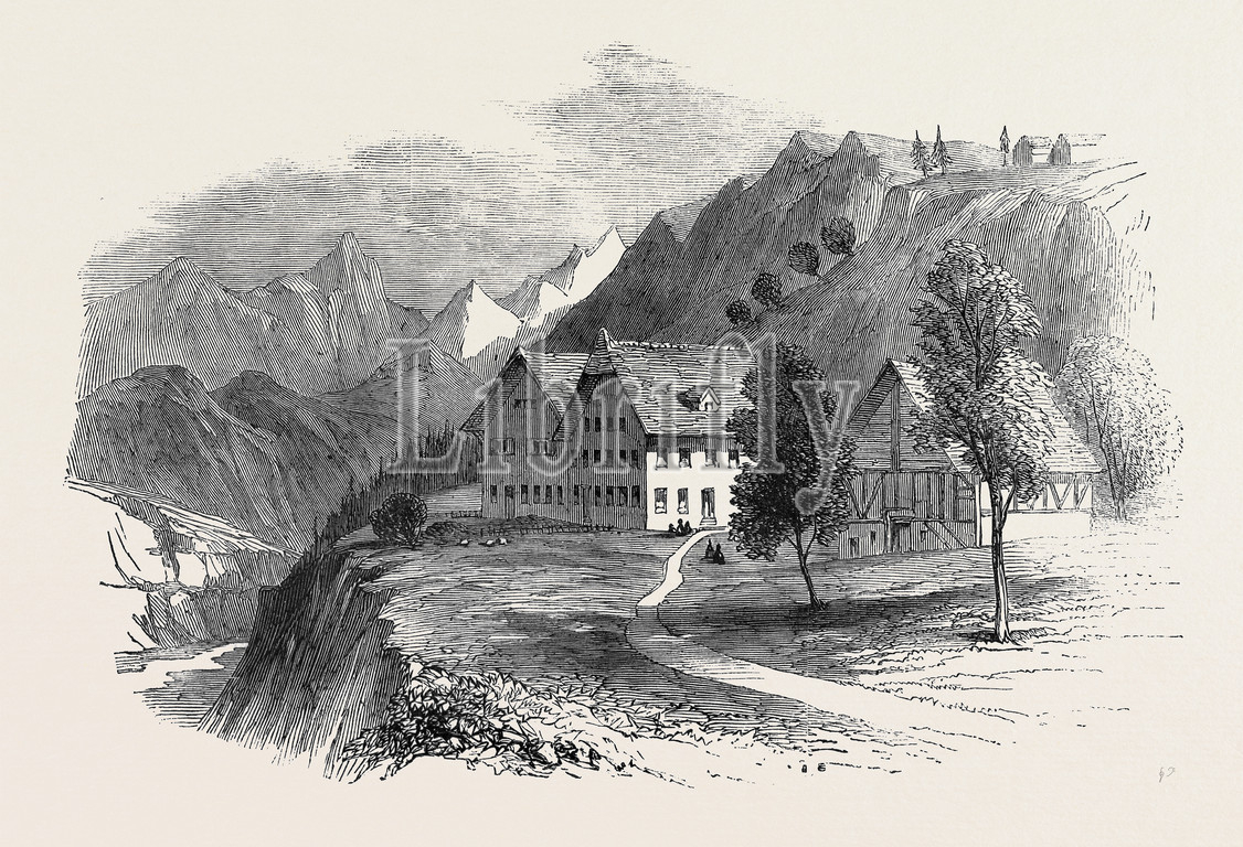 institution, cretins, interlacken, switzerland, 1850 engraving, engraved image, history, illustrative technique, engravement, victorian, arts, culture, retro styled, vintage, retro, arkheia