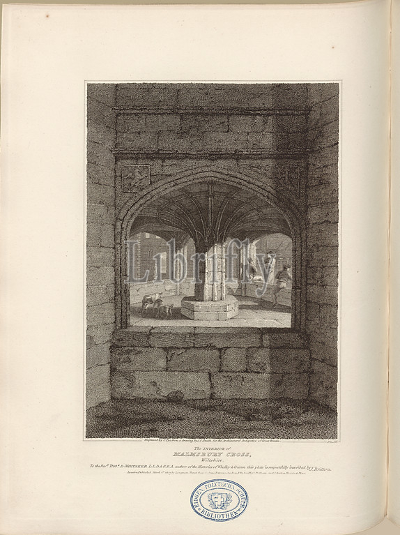 The interior of Malmsbury Cross, Wiltshire, The interior of the Malmesbury Market Cross at Malmesbury, signed: Engraved by C. Pye, from a drawing by J. C. Smith, Fig. 34, Pl. IV, after p. 18, Smith, J. C. (Drawing); Pye, C. (engr.), 1807, John Britton: The architectural antiquities of Great Britain: represented and illustrated in a series of views, elevations, plans, sections and details of various ancient English edifices: with historical and descriptive accounts of each. Bd. 1. London: J. Taylor, 1807-1826
