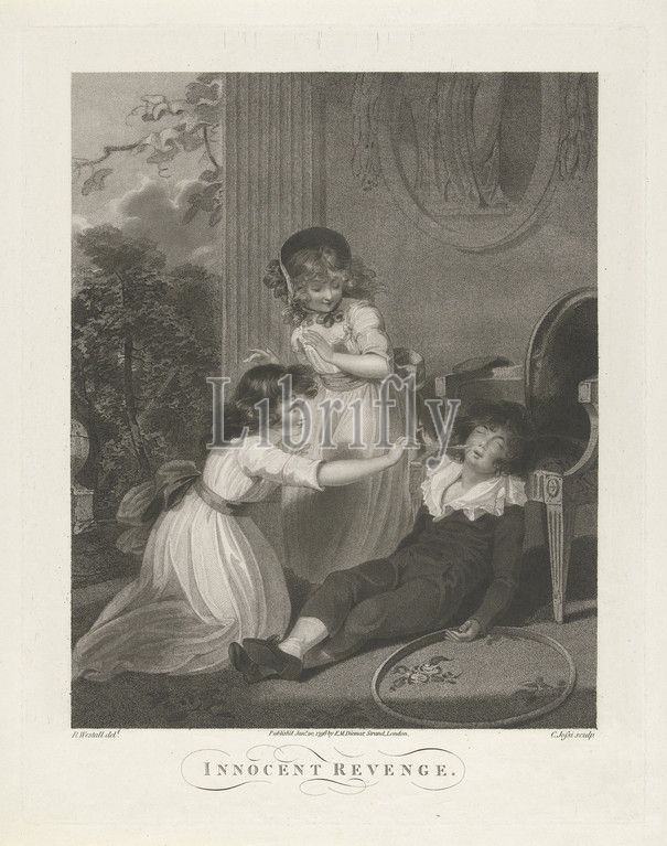 Interior with teasing children Innocent Revenge. (title on object), A girl tickles a sleeping boy with a blade of grass, a second girl watches, teasing (children's games and plays), Christiaan Josi (mentioned on object), London, 20-Jan-1796, paper, engraving, h 456 mm × w 358 mm