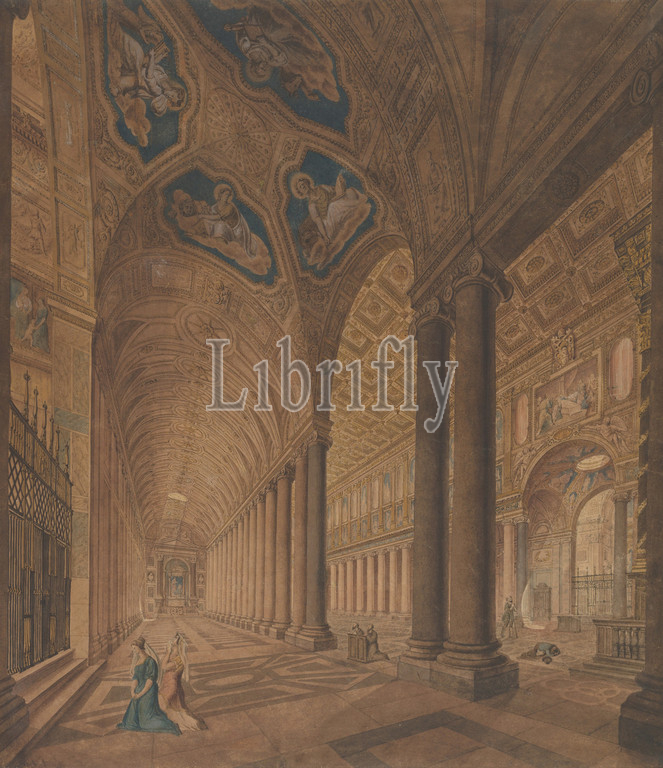 Interior View, Basilica, Santa Maria Maggiore, Rome, 1833, Watercolor, pen, ink, graphite, Sheet, 30 3/8, 13 9/16, 77.2, 34.5 cm, Drawings, Anton Hallmann, German, Hannover, 1812–1845, Livorno