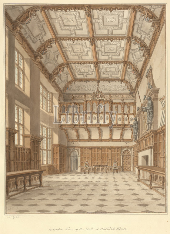 Interior View of the Hall at Hatfield House, John Buckler FSA, 1770–1851, British, and John Chessell Buckler, 1793–1894, British, 1812, Watercolor and pen and black ink on moderately thick, cream wove paper, Sheet: 19 3/4 × 14 inches (50.2 × 35.6 cm) and Image: 13 3/4 × 10 3/4 inches (34.9 × 27.3 cm), architectural subject, country house, engravings, fireplace, half-timbered, Jacobean, strapwork, windows, England, Europe, Hatfield, Hatfield House, Hertfordshire, United Kingdom