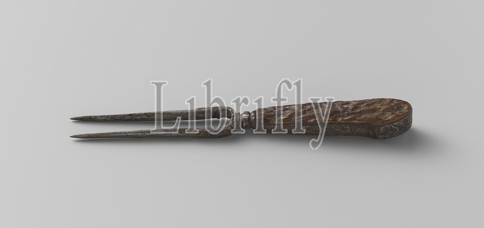 Iron carving fork, two teeth, forged, iron carving fork, decorated, engravings, lifting side, transition, teeth, handle, spherical, sides, front, back sides, stag horn, Nederlanden, c, 1550, 1650, iron, metal, horn, animal material, engraving, l 15 5