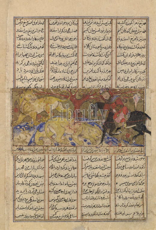 Isfandiyar, Second Course, Slays, Lions, Folio, Shahnama, Book, Kings, ca, 1330–40, Attributed, Iran, Isfahan, Ink, opaque watercolor, gold, silver, paper, Page, 8 1/8 x 5 1/4, 20.6 13.4 cm, Codices, story, encounter, lions, less frequently, depicted, six dangerous, courses', absence, strong illustrative, tradition, allowed, artist, freedom, rendering, scene