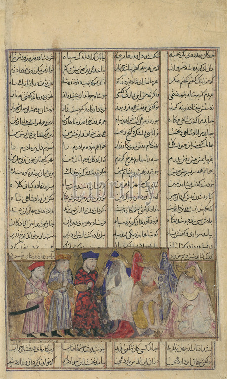 Iskandar, Presence, Brahmins, Folio, Shahnama, Book, Kings, Firdausi, ca, 1330–40, Attributed, Iran, Isfahan, Ink, opaque watercolor, gold, silver, paper, Page, 8 1/16 x 4 7/8, 20.5 12.4 cm, Codices, Alexander, Great, traveled, land, learn, philosophy, content, quest, wisdom, knowledge, enduring goals, crown, conquest, treasure