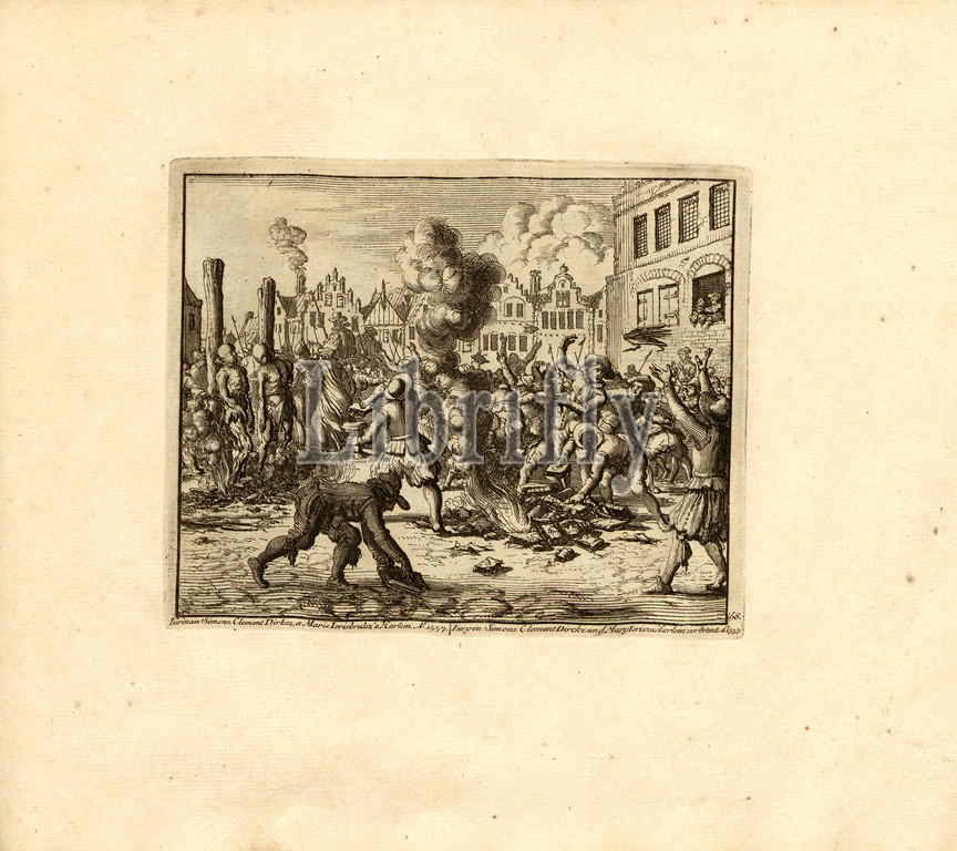 Iurinan Simons, Clement Dirksz, and Marie Iorisbrulez, in Harlem, Anno 1557, Parallel title: Iurgen Simons, Clement Dirckz and Mary Ioris on Harlem spent, A nn o 1557, copper engraving, 68.), p. 145, Luyken, Jan (inv. et fec.), Jan Luyken: Théâtre des martyrs: depuis la mort de J.Christ jusqu'à present: représenté en très belles tailles-douces = Schau-Bühne der Martyrer; gezeichnet und in Kuppfer gestochen. Leyde: chez Pierre Van der Aa, [1711]