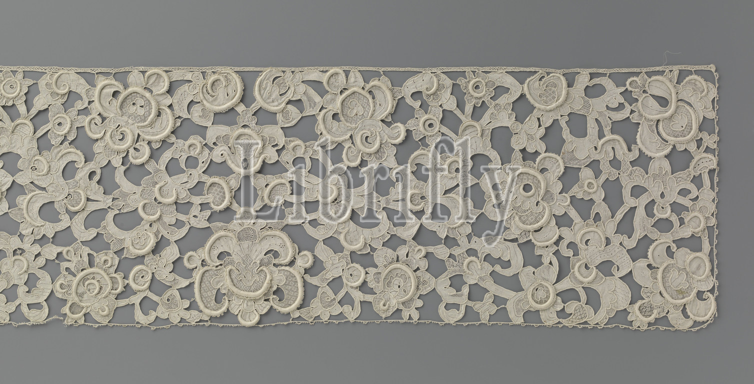 Jabot of needle lace with palmetal flowers, Jabot of natural colored Venetian needle lace 'gros point'. There is a symmetrical decor on a bareless, very open ground, with a very large and a small palm flower in the middle. Volute drinks are hidden among strung leaves and several palmetal flowers. The tendrils in the corners come out a little more. The leaves are split into two volutes as with arabesques and they are richly lobed. The petals show a 'house in house' interior drawing. Straight edge of tiny little lobes., anonymous, Venice, c. 1675 - c. 1695, linen (material), Venetian gros point (heavy raised Venetian lace), l 24 cm × w 82 cm