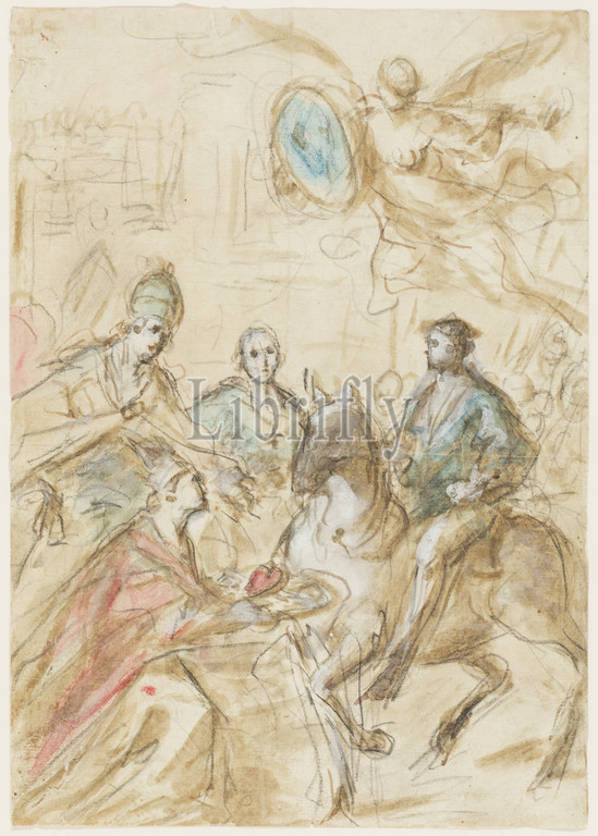 Jacopo Amigoni, Italian, 1675-1752, The Entry of Charles V into Bologna in 1529, between 1675 and 1752, black chalk and brown wash, heightened with white, with blue and red watercolor on buff laid paper, Sheet: 10 5/8 × 7 1/2 inches (27 × 19.1 cm)