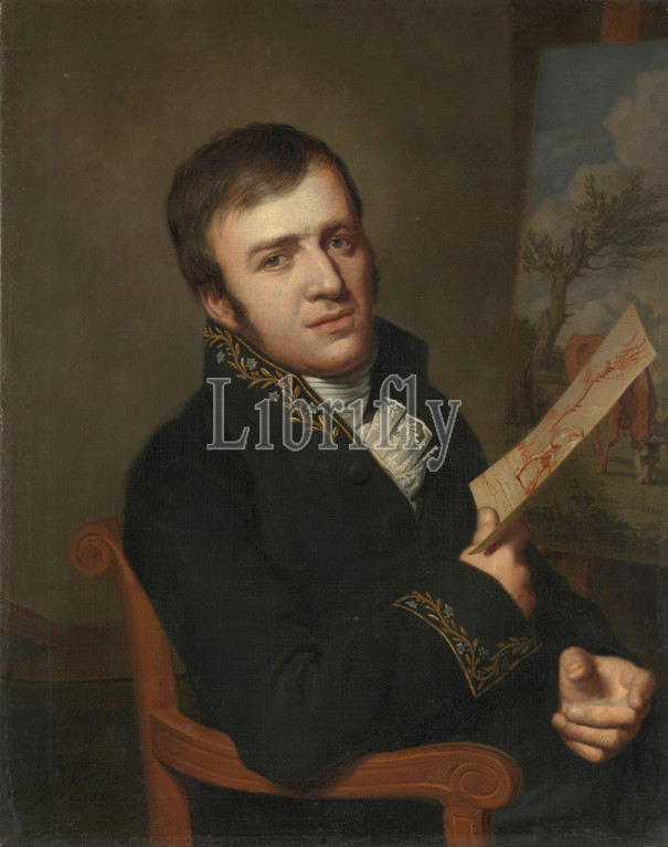 Jan, Baptist, Kobell II, 1778-1814, Painter, Uniform, Member, Royal Institute, Science, Literature, Fine Arts, Portrait, Jan Kobell, II, painter, uniform, member, Sciences, depicted sitting, chair, drawing, hand, front, donkey, painting, landscape, grazing cattle, representation, Willem Bartel van der Kooi, 1811, canvas, oil paint, paint