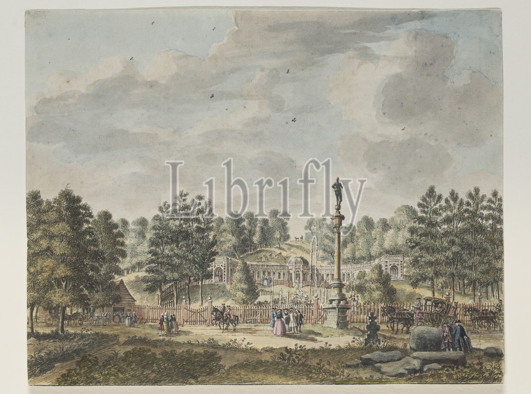 Jan de Beyer, Dutch, 1705-1768, The Amphitheater at Cleves with the Statue of the Iron Man, 1746, pen and black ink and watercolor on buff laid paper, Sheet: 6 1/8 × 7 7/8 inches (15.6 × 20 cm)