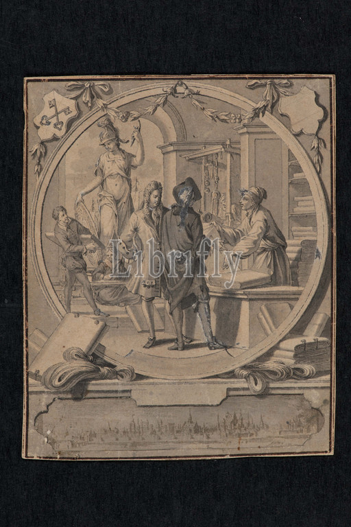 Jan Goeree, first half, 18th century, ink, paper, Medium, 12.7 × 10.3cm, 127 × 103mm, trade, coat, arms, cityscape, Drawing, design, a print depicting, Leiden fabric trade. Within, round frame, foreground two people, eighteenth-century clothing, a person, right, a table, cupboard, bales, woolen fabrics., background, standing Minerva, a web-shaped shield, a weaving coil, occasion attributes., a seated woman, child holding, thread spool, a man, a bundle, cloth under, arm, back right, person, a loom., back, cloudy sky, ship's masts., performance, a cartouche, a cityscape, bales, cloth, cloths attached, loose strands, wool, top shields, left, Leiden city coat, arms, right empty., cityscape, created, a loose rectangular sheet, pasted, back, cartouche cut, paper., image, cut, outline, a red dye, back, contains, empty cartridge, empty coat, arms., a design, a label, depending, version, completed. Furthermore, accents, heightened, white., signed, 2014