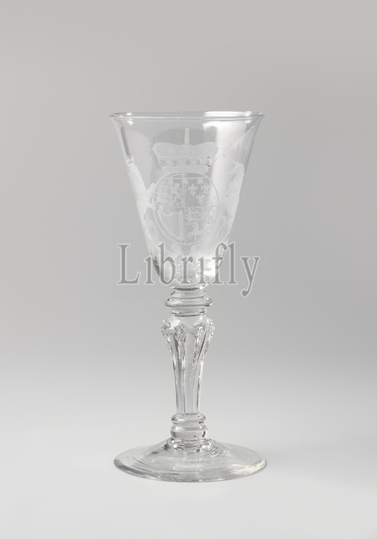 Jar, arms, Anna van Hannover, clear, colorless glass, conical foot, Hexagonal shaped blown trunk, rings, bud, conical chalice, wheel engraving, crowned coat, 1709-1759, c, 1735, 1750, glass, glassblowing