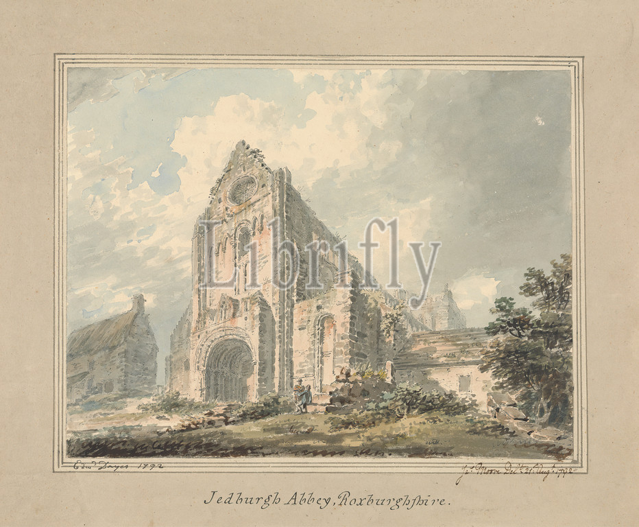Jedburgh Abbey, Roxburghshire, Edward Dayes, 1763–1804, British, And James Moore, 1762–1799, British, 1792, Watercolor and graphite and pen and black ink on medium, slightly textured, cream wove paper mounted to medium, slightly textured, beige wove paper, Sheet: 6 1/2 × 8 1/2 inches (16.5 × 21.6 cm), abbey, architectural subject, church, storm, Europe, Jedburgh Abbey, Roxburghshire, Scotland, United Kingdom