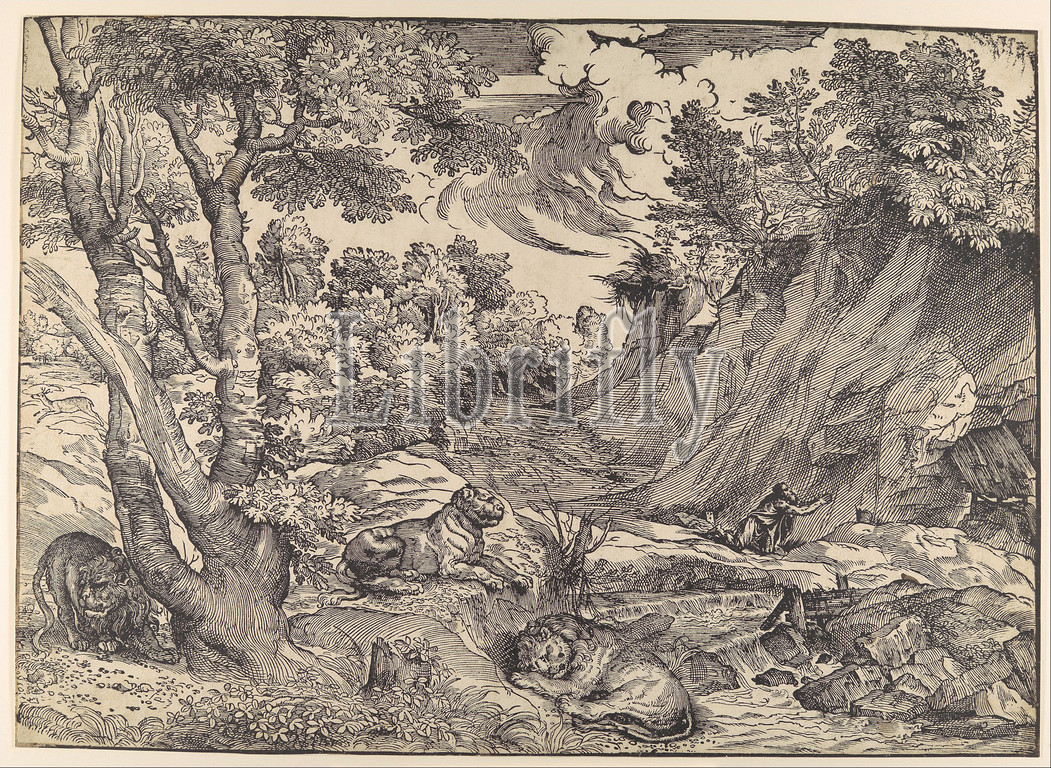 St, Jerome, Wilderness, mid-16th century, Woodcut, Sheet, 15 1/4, 21 5/16, 38.8, 54.1 cm, Prints, Attributed to Nicolò Boldrini, Italian, Vicenza ca., 1500–after, 1566, Venice, Giovanni Britto, German, active Venice, 1536–50, After Titian, Tiziano Vecellio, Pieve di Cadore, 1485/90?–1576, woodcut, illustrates, Titian, involvement, printmaking, means, reproducing, drawings, new expressive, medium, subject, Saint Jerome, favorite theme, Venetian art, fifteenth, depicted, paintings