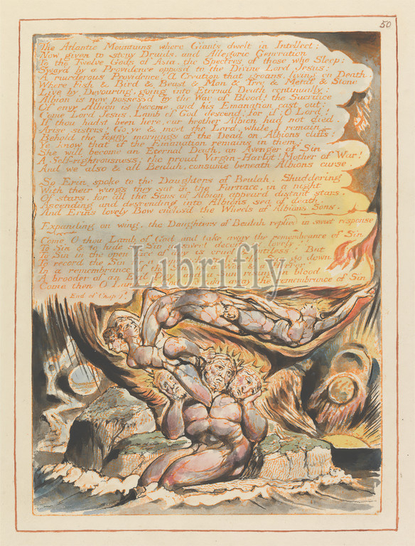 Jerusalem, Plate 50, Atlantic Mountains..., Print, William Blake, 1757–1827, British, 1804, 1820, Relief etching printed, orange, pen, black ink, watercolor, moderately thick, smooth, cream wove paper, Sheet, Plate, clouds, crowns, fire, island, lightning, literary theme, men, moon, nudes, rain, religious, mythological subject, sea, sun, text