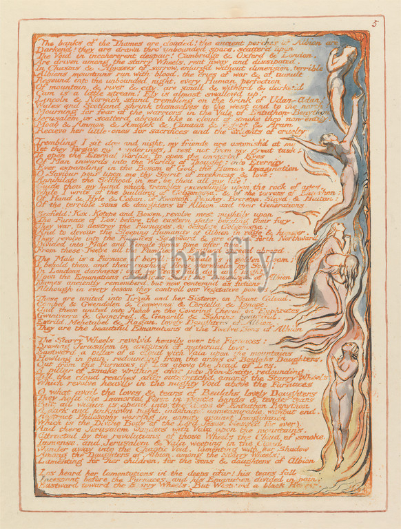 Jerusalem, Plate 5, banks, Thames..., Print, William Blake, 1757–1827, British, 1804, 1820, Relief etching printed, orange, pen, black ink, watercolor, moderately thick, smooth, cream wove paper, Sheet, Plate, fire, flames, kneeling, literary theme, mourning, nudes, religious, mythological subject, sky, text, women