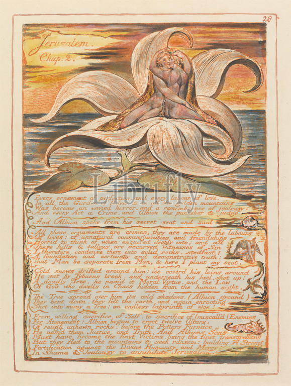 Jerusalem, Plate 28, Jerusalem, Chap, 2..., Print, William Blake, 1757–1827, British, 1804, 1820, Relief etching printed, orange, pen, black ink, watercolor, moderately thick, smooth, cream wove paper, Sheet, Plate, kissing, leaf, literary theme, nudes, religious, mythological subject, shells, sky, sun, text, women