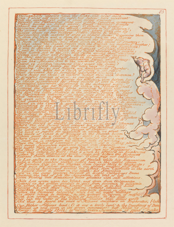 Jerusalem, Plate 83, Corruptability, upon thy limbs..., Print, William Blake, 1757–1827, British, 1804, 1820, Relief etching printed, orange, pen, black ink, watercolor, moderately thick, smooth, cream wove paper, Sheet, Plate, clouds, literary theme, nudes, religious, mythological subject, sky, smoke, text