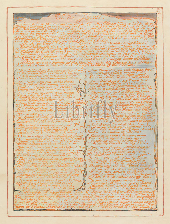 Jerusalem, Plate 27, 'To the Jews....', Print made by William Blake, 1757–1827, British, 1804 to 1820, Relief etching printed in orange with pen and black ink and watercolor on moderately thick, smooth, cream wove paper, Sheet: 13 1/2 x 10 3/8 inches (34.3 x 26.4 cm) and Plate: 8 3/4 x 6 3/8 inches (22.3 x 16.2 cm), leaf, literary theme, religious and mythological subject, text, vegetation, vines