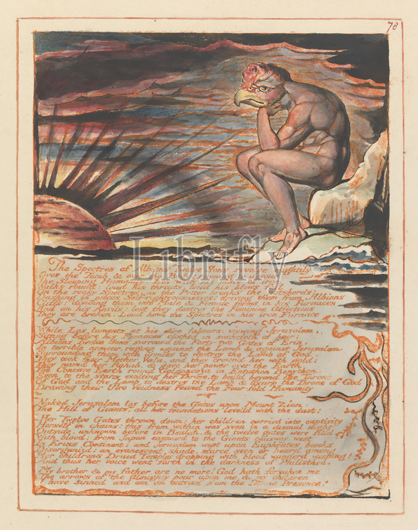 Jerusalem, Plate 78, 'The Spectres of...', William Blake, 1757–1827, British, 1804 to 1820, Relief etching printed in orange with pen and black ink and watercolor on moderately thick, smooth, cream wove paper, Sheet: 13 1/2 x 10 3/8 inches (34.3 x 26.4 cm) and Plate: 8 1/4 x 6 3/8 inches (21 x 16.2 cm), beak, clouds, darkness, literary theme, men, mythological figures, nudes, religious and mythological subject, rooster, sitting, stones, sun, sunset, text, vines, water, waves (natural events)